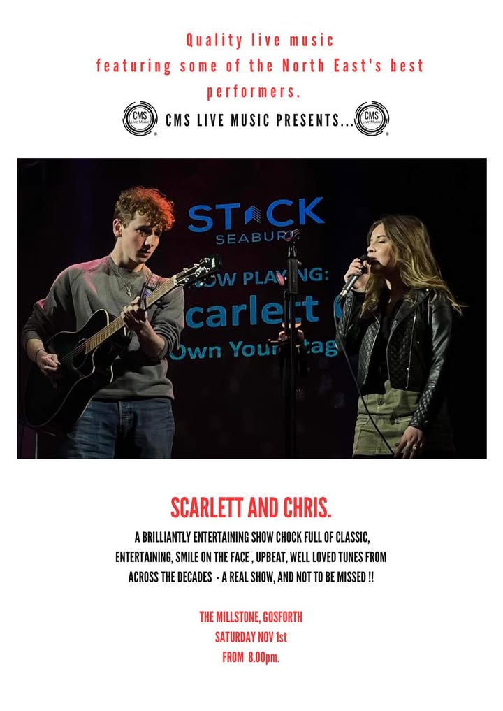 Join us at The Millstone, South Gosforth for an incredible night of live music with the amazing Scarlett & Chris Duo — a talented duo bringing you the very best from: