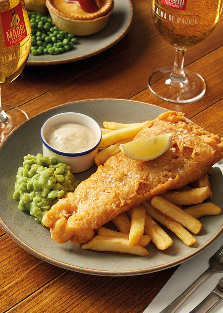 Beer-battered fish & chips, with your choice of garden or mushy peas (†) | 13.79 1095 kcals