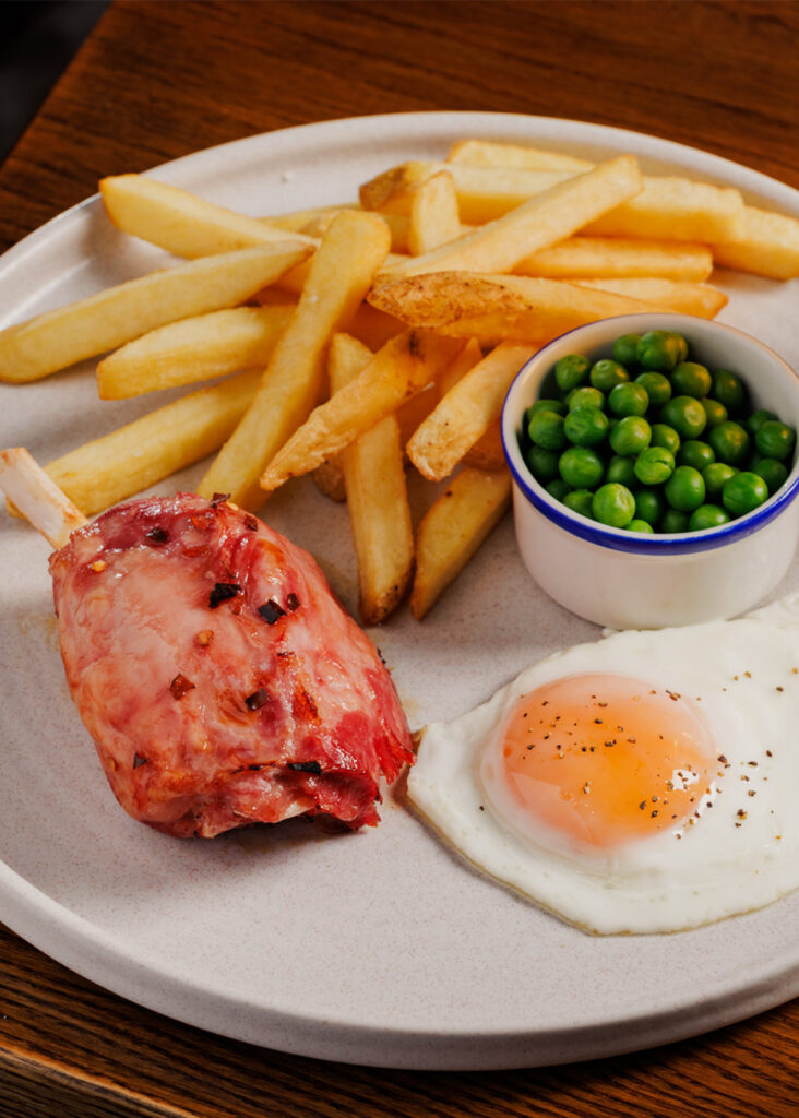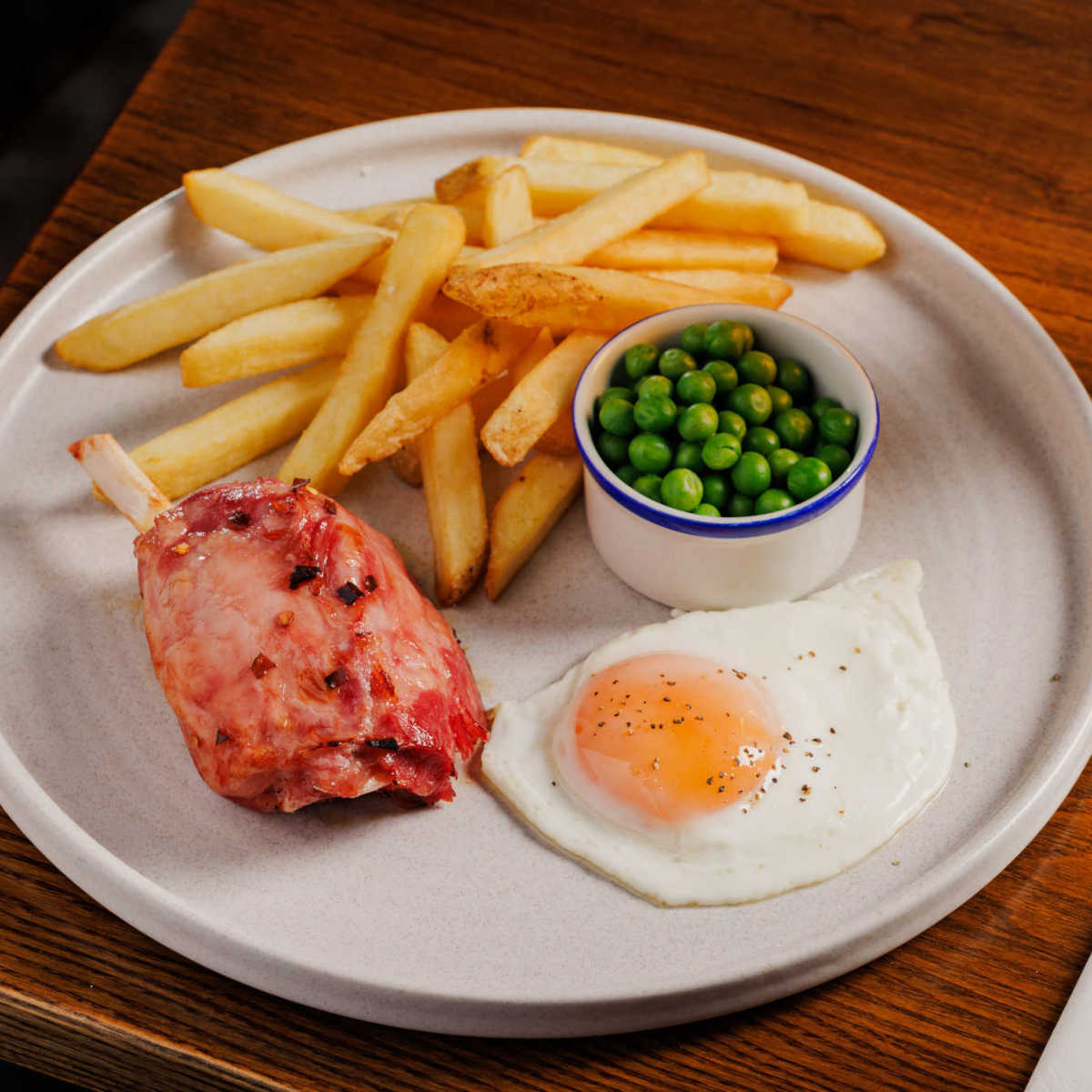 Honey-glazed ham hock, with a free-range fried egg, chips and garden peas | 16.49 1217 kcals