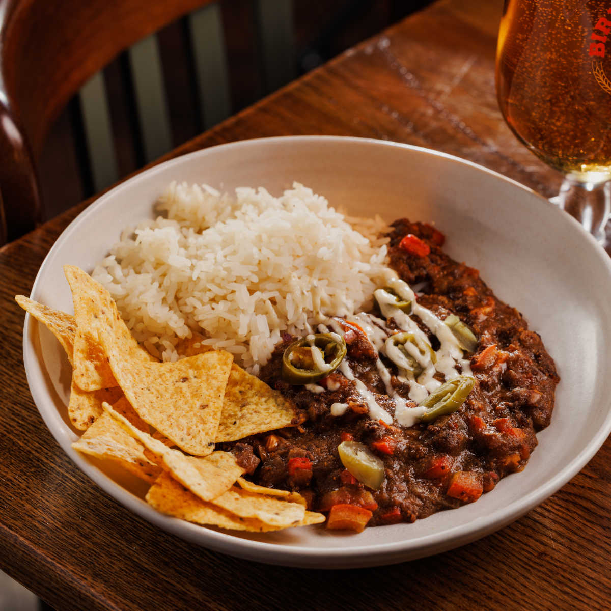 Chilli con carne, with long-grain rice, tortilla chips and jalapeños | 11.79 526 kcals